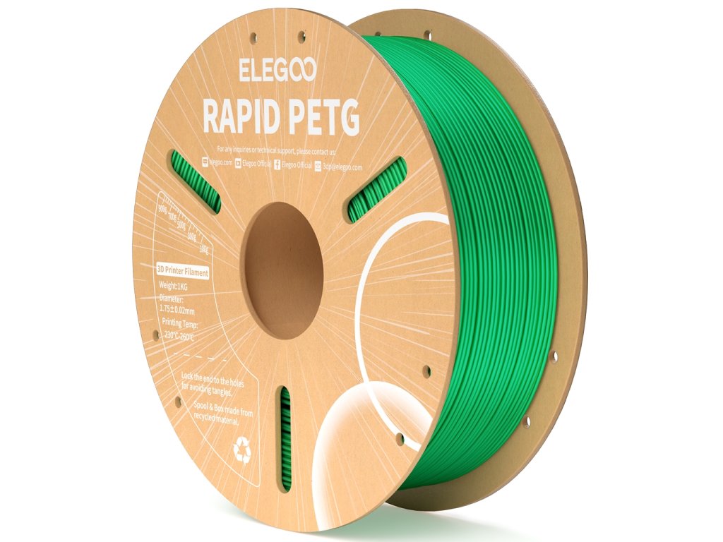 ELEGOO Rapid PETG je materiál, který kombinuje snadnost tisku jako u PLA s mechanickou pevností a odolností PETG. Určen pro funkční díly, prototypy, venkovní aplikace nebo jakýkoliv projekt, kde je potřeba rychlého výkonu + vyšší odolnosti vůči nárazům, povětrnosti či chemikáliím.