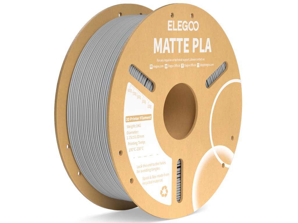 ELEGOO PLA MATTE je verze PLA s matným, méně lesklým povrchem a tlumenými, pastelovými barvami. Díky tomu lépe zakrývá vrstvy tisku a má elegantní vzhled vhodný pro dekorace, figurky, makety, modely, designové komponenty a další projekty, kde je estetika a jemnost povrchu důležitější než maximální mechanická nebo tepelná odolnost